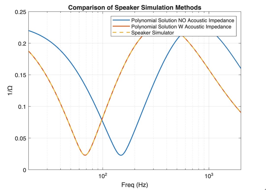 Et voila! with a little bit of computer assisted algebra, we can take a lumped element model and convert it into a time-domain filter to be applied directly to incoming signals. In this case, we solved the algebra to get us the time-domain impedance of a transducer model, but with some simple re-arranging and a little code we can convert voltage to excursion, SPL, velocity, transmitted force, and much more!