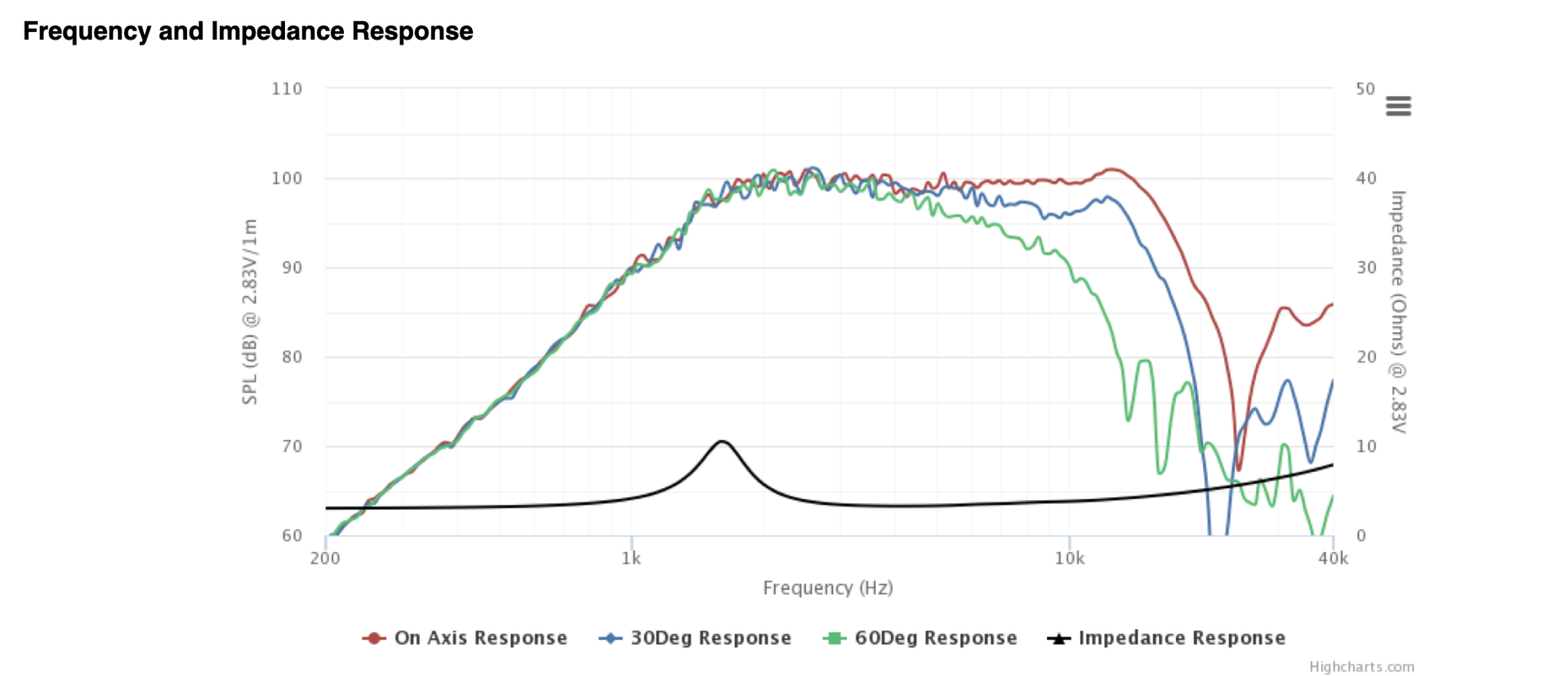Checking it against a real transducer (I switched TS parameters for this one to the ND91-4 by Dayton Audio, a classic mini-woofer)—overlaying the simulated response on top of the DATS measured impedance response (blue line) by Dayton Audio vs our orange polynomial line, it looks pretty damn close up to 1kHz! The loss off accuracy above 1k is most likely due to the secondary inductance/resistance of the magnetic circuit, which is not typically reported by manufacturers in the TS parameters or datasheets and therefore not modeled.